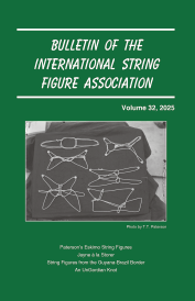 - Hunting Frame Strings: Variations of Two Pacific Island String Figures by Cozette Griffin-Kremer, Rambouillet, France (pages 119-137) - In this two-part article the author alters and/or embellishes the construction methods of two traditional Pacific Island string figures ('Milky Way' and 'Kami Moa') to create variations that retain their "frame" (upper and lower transverse) strings. In the first set of variations Opening A is altered, or replaced with a double-walled diamond figure. Methods for altering internal movements and partially deconstructing the finished pattern are also explored. In the second set of variations a "threading" technique is utilized in which finger loops are passed through non-finger loops that are embedded in the partially completed pattern. The final patterns resemble ornate calligraphy.